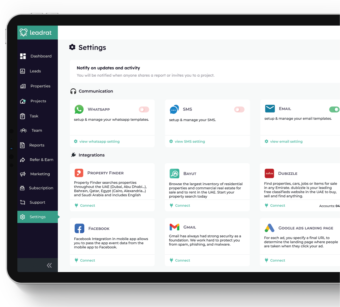 Connect your Property Management CRM with leading tools like Facebook, Gmail, WhatsApp, Bayut, and Property Finder all in just a few clicks.